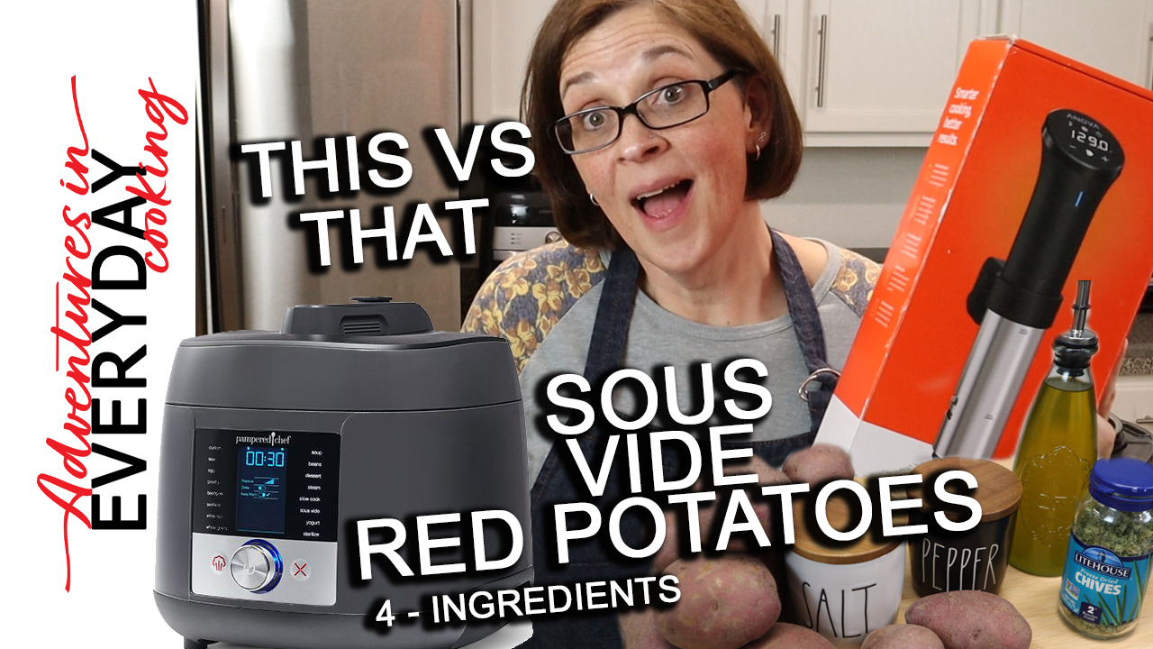 Today we are going to pit the new #PamperedChef #DeluxeMultiCooker against the #Anova Immersion Circulator in a sous vide test of the veggie-kind! We are going to take some red potatoes, some beautiful garlic infused olive oil, some chives, and salt and pepper; and we are going to get them into our separate containers…